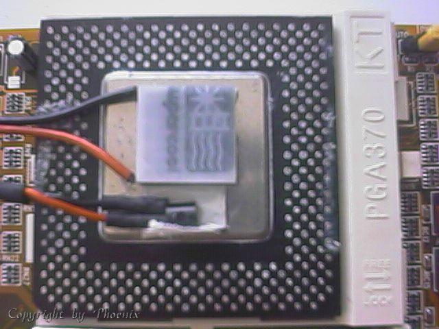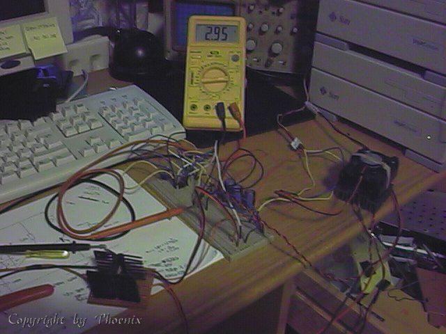I did many tests with many compibantions of MHz and core voltage and I finally realised that my first suspicions were true. The peltier was capable of cooling my CPU in standard settings and at some higher speeds/voltages, but not sufficient enough for my goal (666MHz, using an undocumented setting of my motherboard). The project was finished. Although it didn't work as expected I gained a lot of understanding about how peltiers work. Also I realised (one more time) that 'digital' is better than 'analogue'. The controller circuit although worked fine it didn't have the accuracy needed (when the min-max limits have a few degrees difference with 10mV per degree measurements, the system must have a very good accurady and fast responce). For this reason I desided to do an addition to my other project called 'Therm0', and use one of it's sensors (or even the internal thermistor of the CPU), and one outputs to control a more powerfull peltier (hopefully a 72W one) using a power MOSFET. When I gather the required money for the independent PSU needed and the peltier, I will continue the project.
