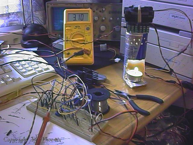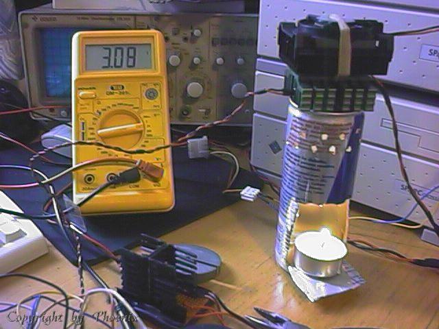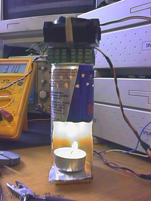 The next stage was to do a simulation in the required operating condidions. For this reason a custom made 'CPU emulator' with variable load was designed using an empty Red-Bull can, a tea-light candle, and one slim AAA battery. The 'emulator' was set to provide just enough heat to the heatsink so that it could raise the temperature a few degrees. Then the device was switched on. The heatsink was at aproximately 37C at the beginning. After a while it started falling to 35C , 34C, and after a while stabilised at 31C. I did a few other tests and the final results showed that this peltier was not very powerfull. Because the heat source was quite a lot more powerfull than a typical CPU and the 'load control' was not very reliable, I decided to build the prototype board and do a test with a real CPU.